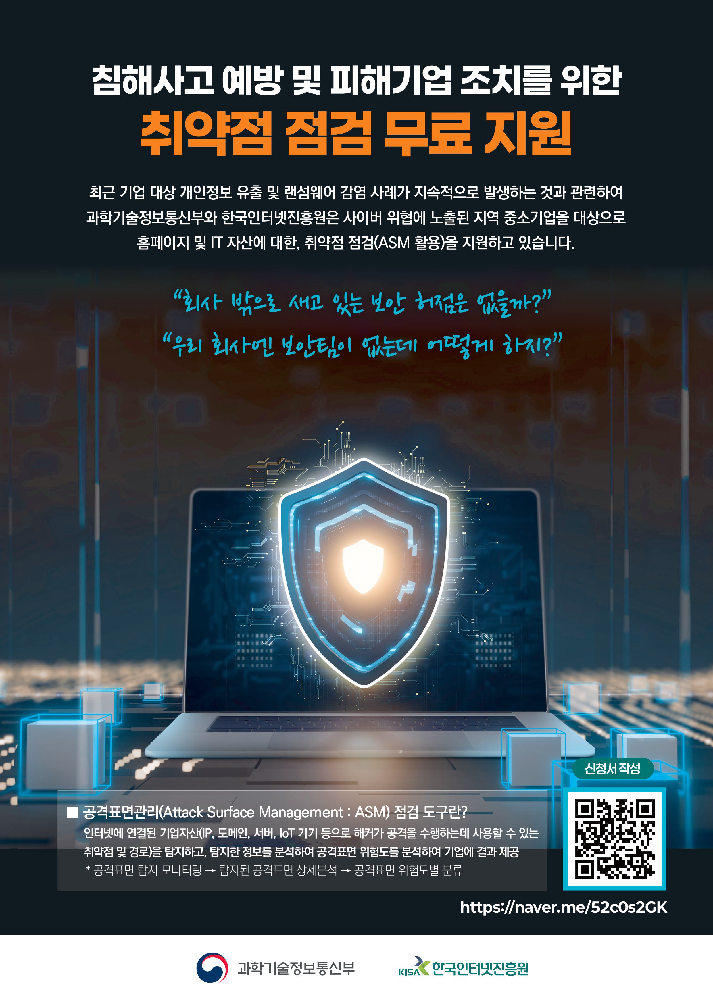 과학기술정보통신부, 한국인터넷진흥원, 인천시, 인천테크노파크에서는 최근 기업 대상 개인정보유출 및 랜섬웨어 감염 사례가 지속적으로 발생하는 것과 관련하여 사이버 위 협에 노출된 인천지역 중소기업을 대상으로 홈페이지 및 IT 자산에 대한 취약점 점검(ASM 활용)을 무료로 지원함을 알려드립니다.